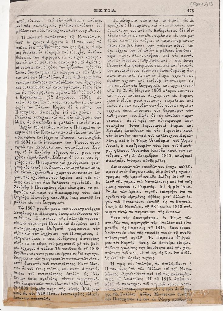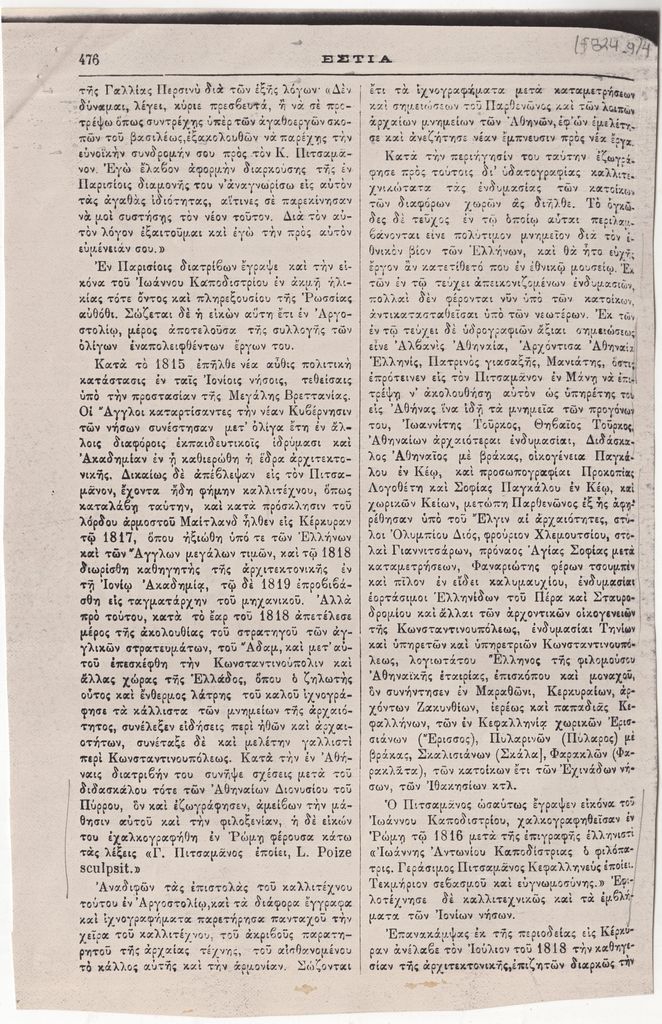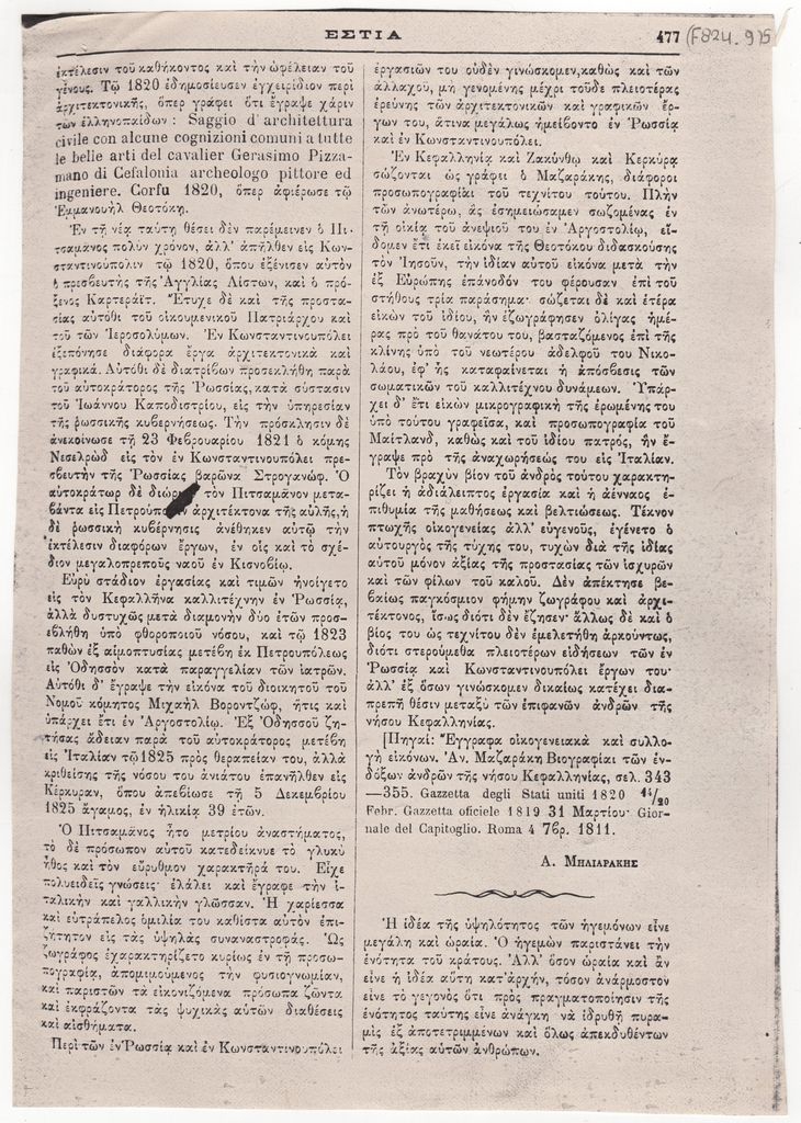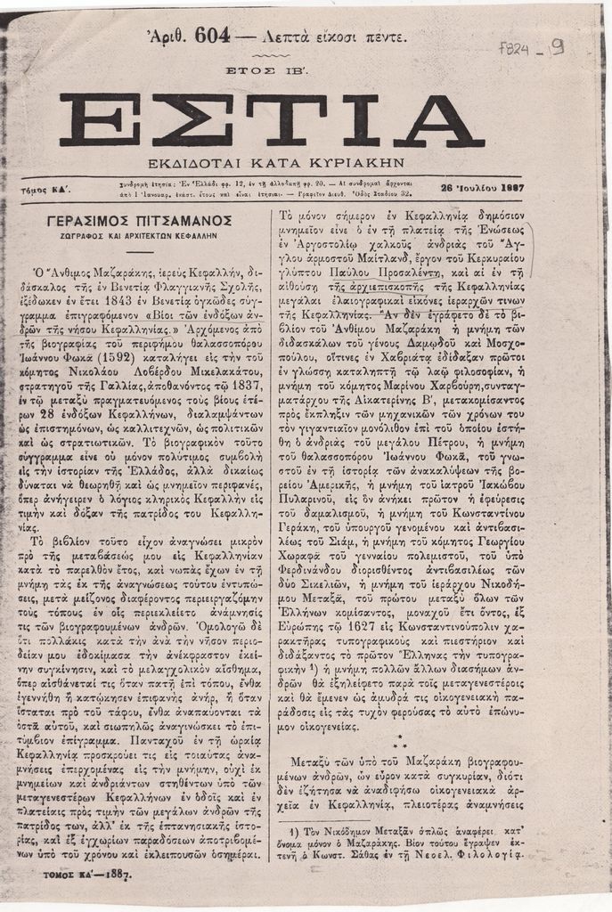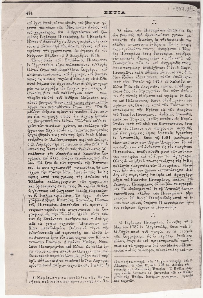 Φωτοαντίγραφο αποκόμματος, χαρτί, στα ελληνικά, 5 φφ, 26,5×21,5 εκ., όπου δημοσιεύεται, στα ελληνικά, άρθρο του Α. Μηλιαράκη για τον ζωγράφο Γεράσιμο Πιτσαμάνο.