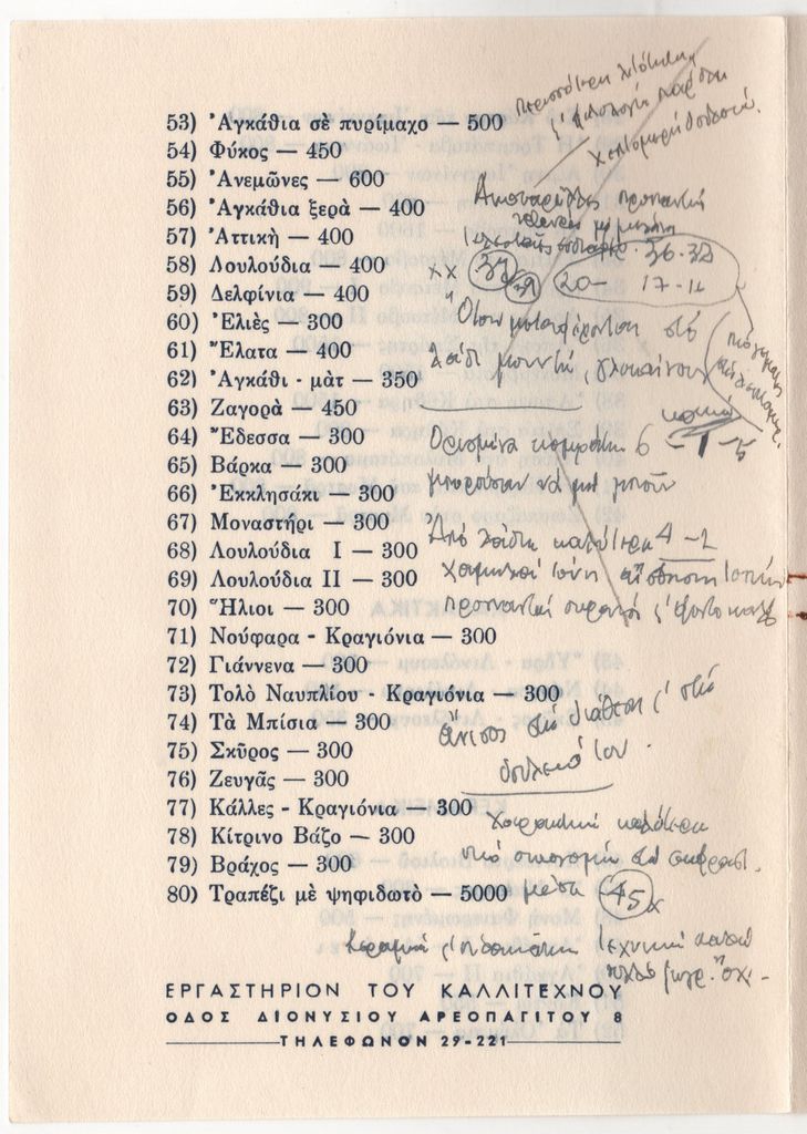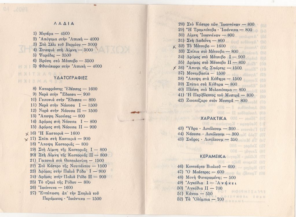 Έντυπο, στα ελληνικά, δίπτυχο, χαρτί, 17,5×12,2 εκ. Τιμοκατάλογος των έργων της ατομικής έκθεσης ζωγραφικής, χαρακτικής και κεραμικής του Κώστα Πλακωτάρη στην Αθήνα το 1957. Στην τελευταία σελίδα, σημειώσεις κριτικής του Τώνη Σπητέρη.
