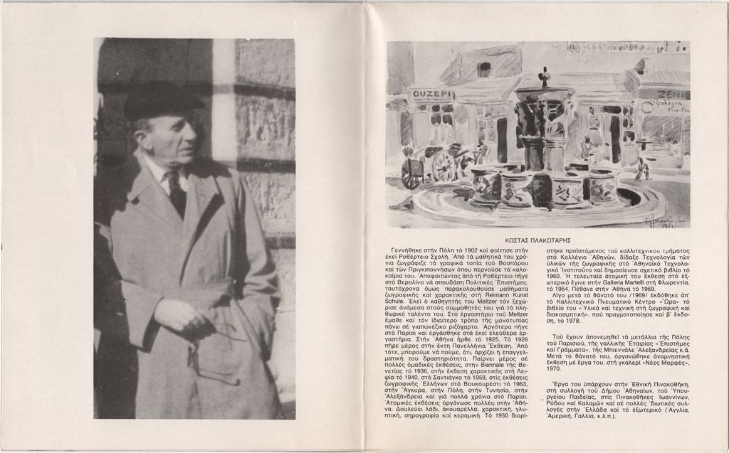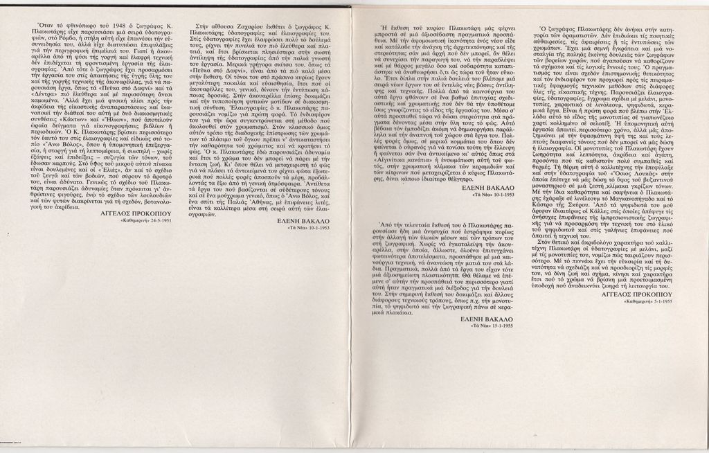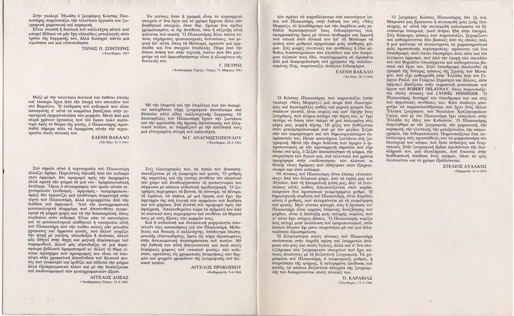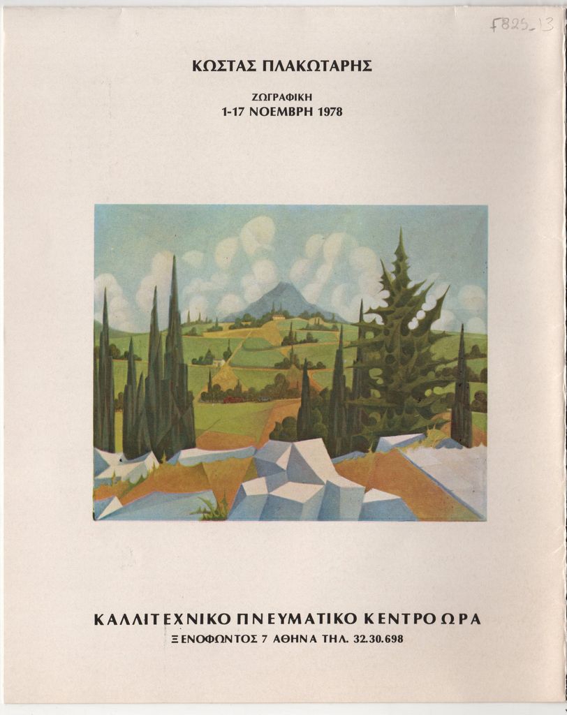 Έντυπο, στα ελληνικά, διπλωμένο στα τέσσερα, γυαλιστρό χαρτί, 21,3×17,2 εκ. Έντυπο της αναδρομικής έκθεσης έργων του Κώστα Πλακωτάρη με αφορμή τη συμπλήρωση 10 χρόνων από το θάνατό του στην Αθήνα τον Νοέμβριου του 1978. Περιέχει βιογραφικό καλλιτέχνη και αποσπασματα κριτικών από τον ελληνικό τύπο.
