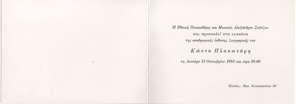 Έντυπο, στα ελληνικά, δίπτυχο, χαρτόνι, 11,0×14,5 εκ. Πρόσκληση της αναδρομικής έκθεσης έργων του Κώστα Πλακωτάρη που διοργανώθηκε στην Αθήνα τον Οκτώβριο του 1983.