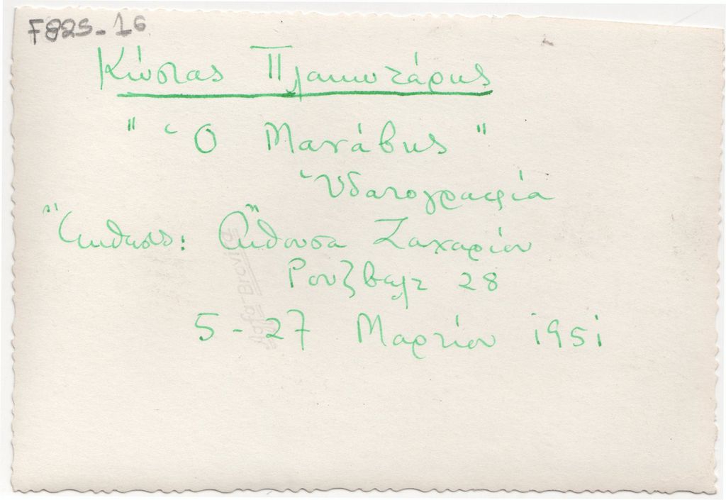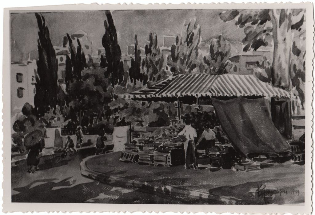 Φωτογραφία, α/μ, φωτογραφικό χαρτί, 7,7×11,5 εκ. Αναπαραγωγή του έργου του Κώστα Πλακωτάρη με τίτλο «Ο μανάβης», 1949. Στην πίσω όψη, επιγραφή με τα στοιχεία του έργου, όπου αναφέρεται ότι εκτέθηκε στην Αίθουσα Ζαχαρίου το 1951.