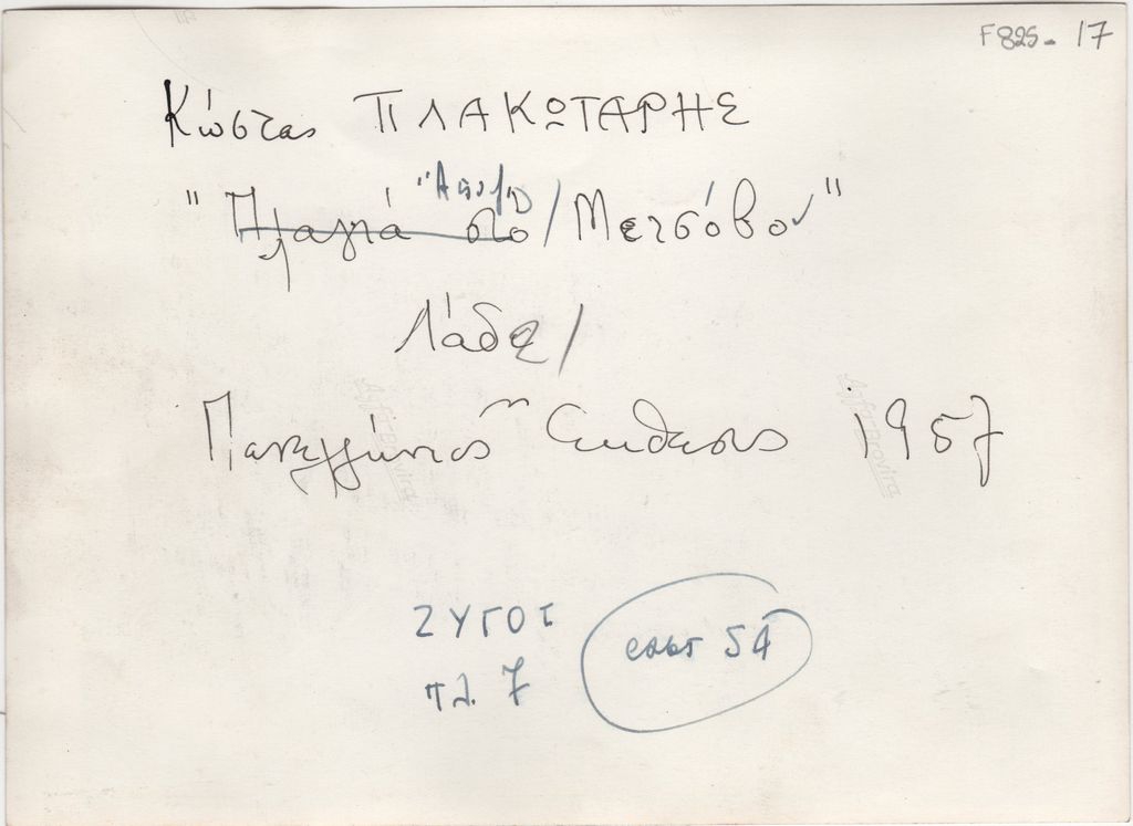 Φωτογραφία, α/μ, φωτογραφικό χαρτί, 13,0×18,0 εκ. Αναπαραγωγή έργου του Κώστα Πλακωτάρη. Στην πίσω όψη, επιγραφή με τα στοιχεία του έργου, όπου αναφέρεται ότι εκτέθηκε στην Πανελλήνιο Έκθεση το 1957.