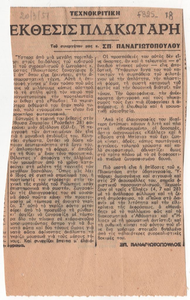 Απόκομμα, έντυπο, χαρτί, 16,0×10,0 εκ., όπου δημοσιεύεται, στα ελληνικά, κριτική του Σπ. Παναγιωτόπουλου για την ατομική έκθεση του Κώστα Πλακωτάρη στην Αθήνα 1951. Επάνω, επιγραφή με τα στοιχεία της δημοσίευσης.