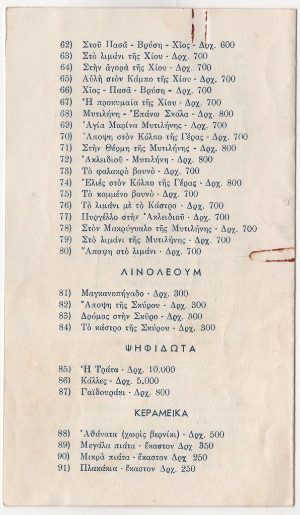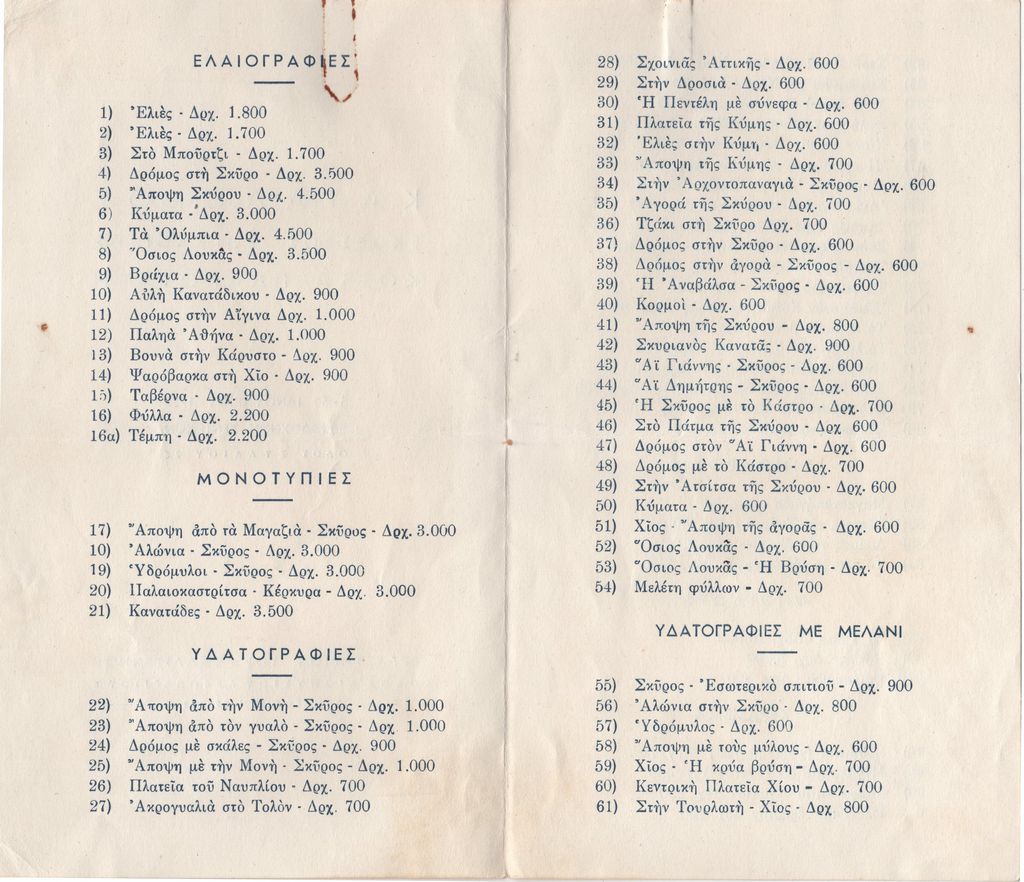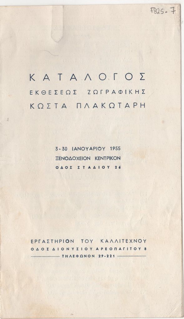 Έντυπο, στα ελληνικά, δίπτυχο, χαρτί, 19,7×11,5 εκ. Τιμοκατάλογος των έργων της ατομικής έκθεσης ζωγραφικής του Κώστα Πλακωτάρη στην Αθήνα το 1955.