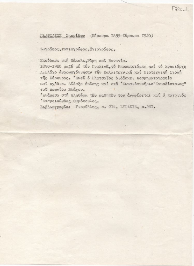 Κείμενο, δακτυλόγραφο, χαρτί, 29,8×21,5 εκ. Σημειώσεις βιογραφικού για τον Σπυρίδωνα Πλατσαιού, δακτυλόγραφο, στα ελληνικά. Αναφέρεται στις σπουδές και επαγγελματική δραστηριότητα και βιβλιογραφία.