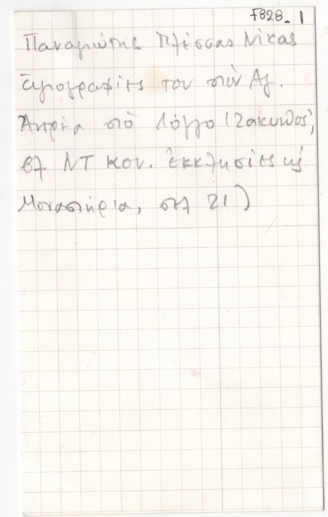 Κείμενο, χειρόγραφο, με μολύβι, στα ελληνικά, σε απόκομμα καρτέλας αποδελτίωσης, χαρτόνι, μία όψη, 12,5×7,5 εκ. Στοιχεία και βιβλιογραφική πηγή για τον ζωγράφο Παναγιώτη Πλέσσα Νίκα.