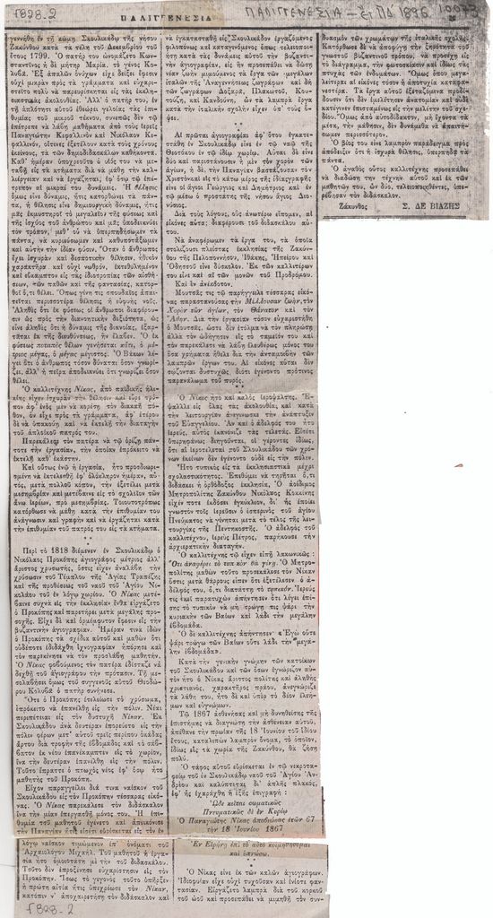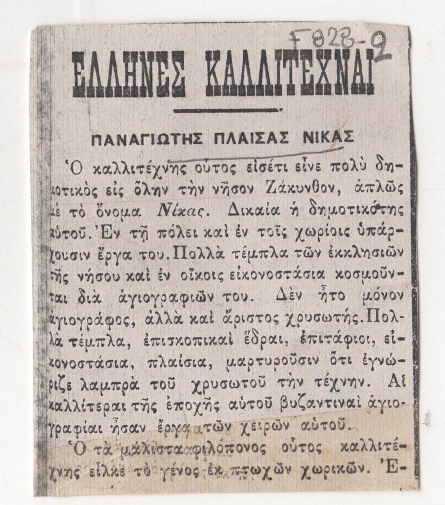 Φωτοαντίγραφο αποκομμάτων, έντυπο, χαρτί, 3 τμήματα, α) 6,5×5,5 β) 28,8×16,7 (ακανόνιστο σχήμα) γ) 3,0×11,0 εκ., όπου δημοσιεύεται, στα ελληνικά, άρθρο του Σ. Δε Βιάζη για τον αγιογράφο Παναγιώτη Πλέσσα Νίκα «Παναγιώτης Πλαίσας Νίκας». Επάνω στο δεύτερο απόκομμα, επιγραφή