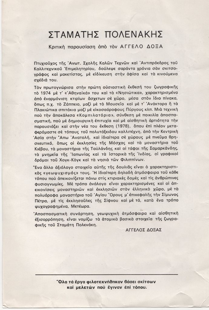 Έντυπο, στα ελληνικά, μονόφυλλο, ιλουστρασιόν χαρτί, δύο όψεις 25,0×17,8 εκ. Πρόσκληση της ατομικής έκθεσης ζωγραφικής του Σταμάτη Πολενάκη με τίτλο, «Ελλάδα – Ρωσσία – Κεντρ. Ασία – Άπω Ανατολή», που πραγματοποιήθηκε στην Αθήνα τον Οκτώβριο του 1978. Περιέχει κριτική του Άγγελου Δόξα. Η μία όψη, εικονογραφείται.