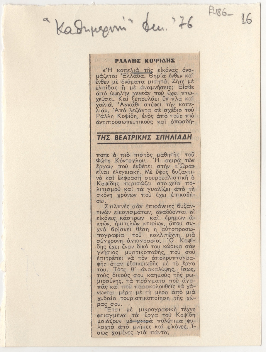 Απόκομμα, χαρτί, συρραμμένο σε απόκομμα, 16×12 εκ., στα ελληνικά, δημοσίευσης κριτικής έκθεσης του Ράλλη Κοψίδη, η οποία διεξάγεται στο Καλλιτεχνικό Πνευματικό Κέντρο Ώρα.
