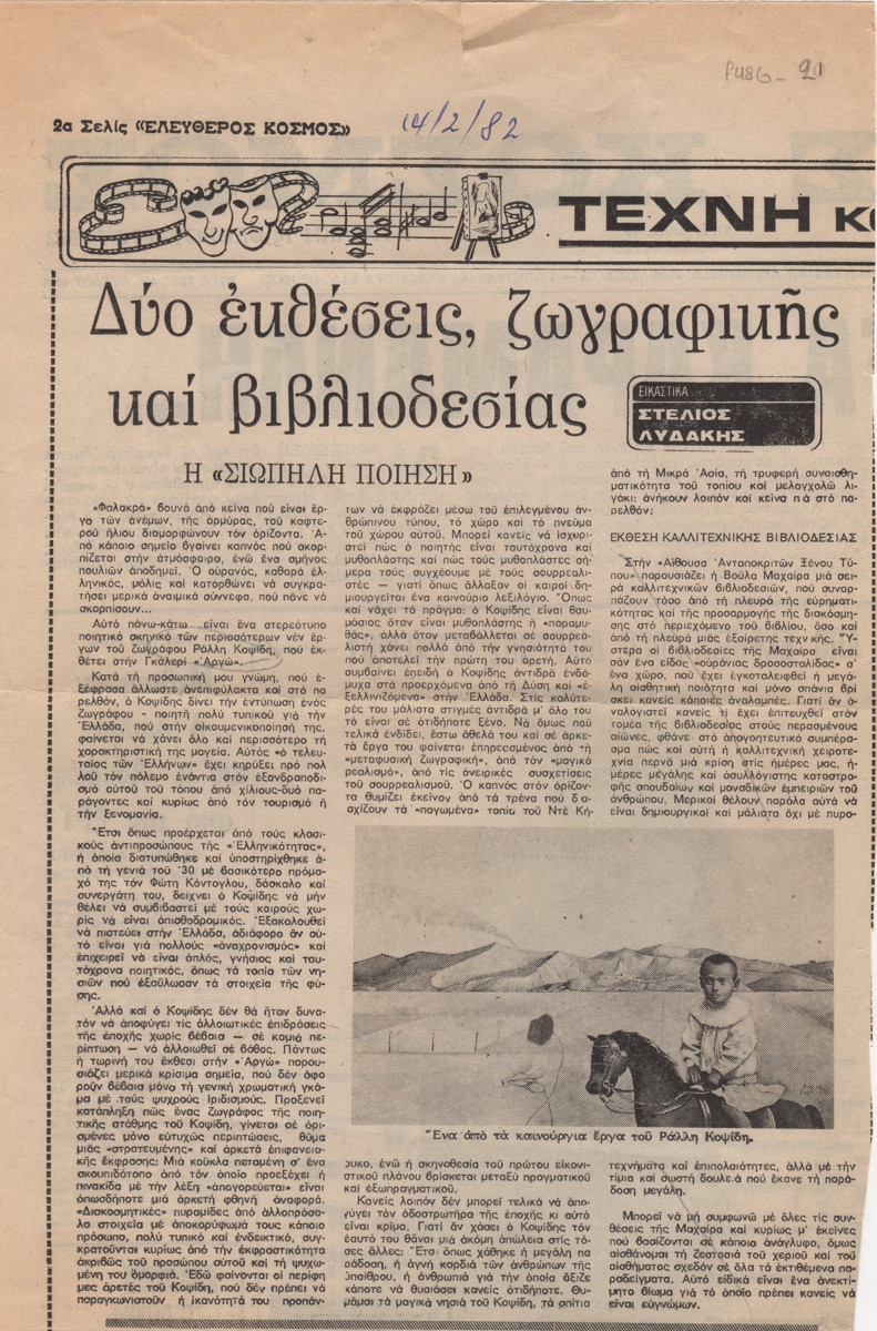 Απόκομμα, χαρτί, 33×21 εκ., στα ελληνικά, δημοσίευσης κριτικής έκθεσης του Ράλλη Κοψίδη, η οποία διεξάγεται στην Γκαλερί Αργώ στην Αθήνα. Στο ίδιο, σχολιάζεται έκθεση βιβλιοδεσίας της Βούλας Μαχαίρα.