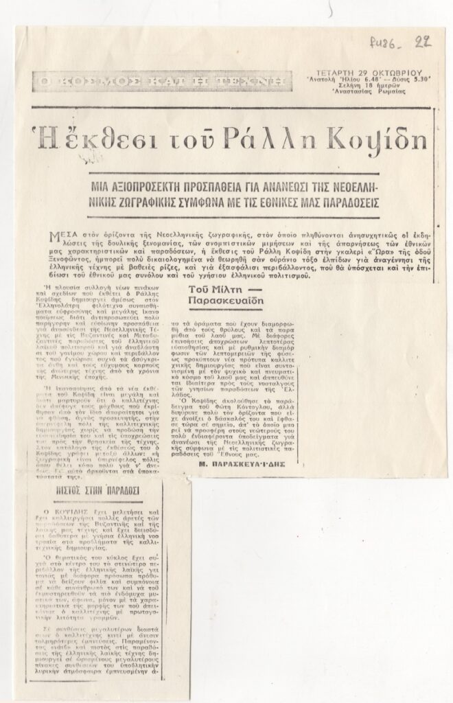 Φωτοαντίγραφο, χαρτί ακανόνιστου μεγέθους, στα ελληνικά, δημοσίευσης κριτικής έκθεσης του Ράλλη Κοψίδη, η οποία διεξάγεται στο Καλλιτεχνικό Πνευματικό Κέντρο Ώρα.