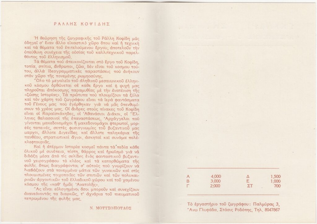Έντυπο, χαρτόνι αναδιπλωμένο, 17,5×12,5 εκ., στα ελληνικά, ατομικής έκθεσης ζωγραφικής του Ράλλη Κοψίδη. Περιέχει κείμενο για τον καλλιτέχνη και το έργο του, τιμοκατάλογο των εκτιθέμενων έργων και εικονογράφηση.