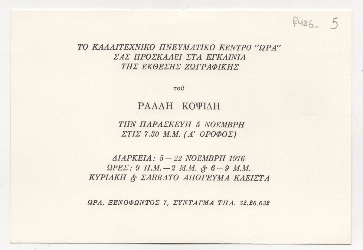 Πρόσκληση, χαρτόνι, 11×16 εκ., στα ελληνικά, εγκαινίων ατομικής έκθεσης ζωγραφικής του Ράλλη Κοψίδη.