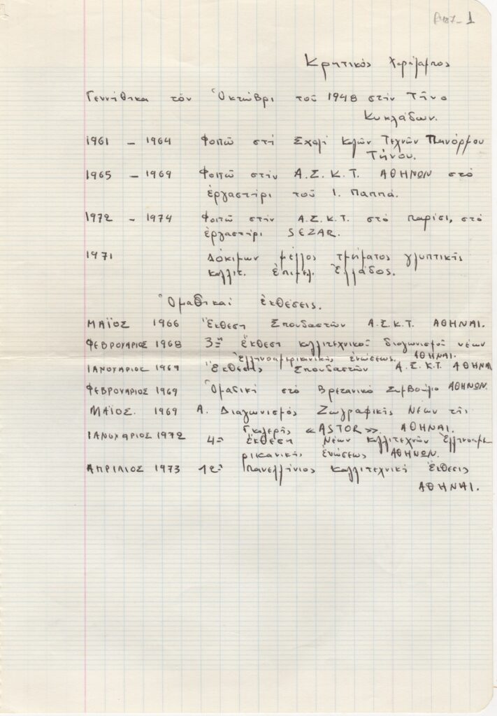 Βιογραφικό, ιδιόγραφο, χαρτί, 29,5×21 εκ., στα ελληνικά, του Μπάμπη Κρητικού. Περιέχει σπουδές και λίστα εκθέσεων.