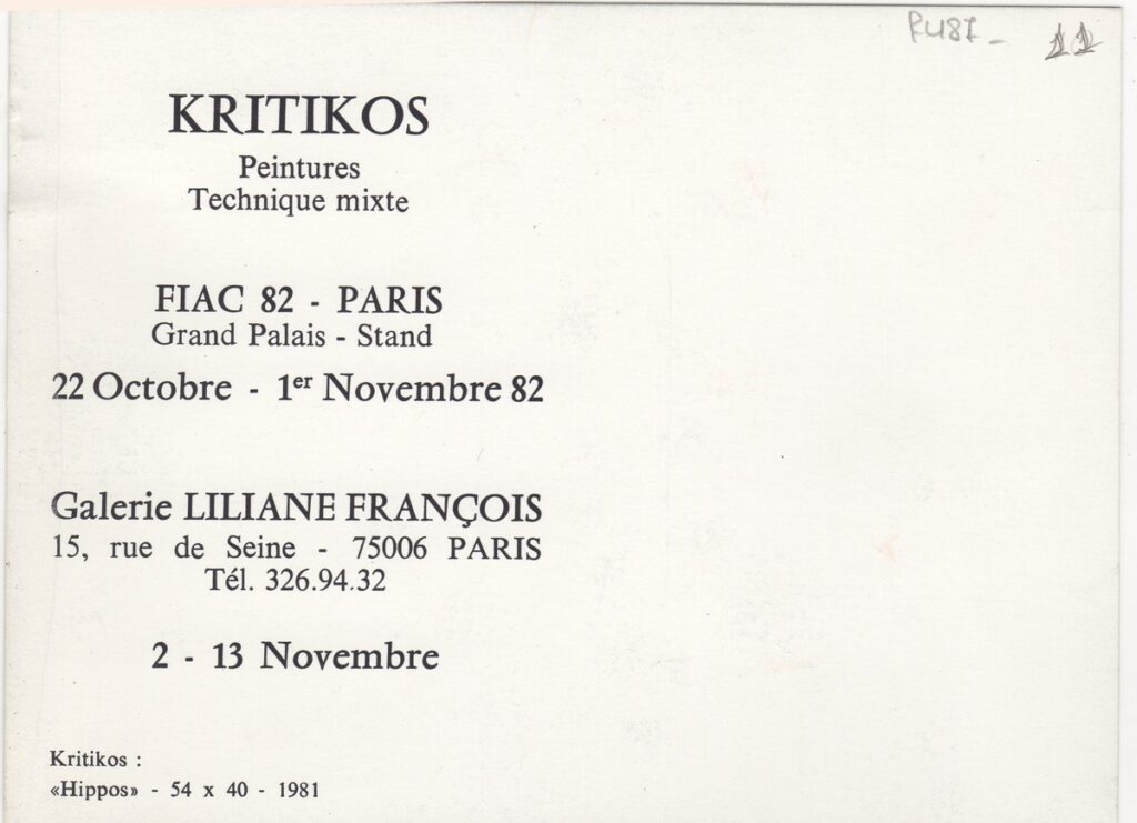 Πρόσκληση, χαρτόνι διπλής όψης, 11,5×15,5 εκ., στα γαλλικά, εγκαινίων ατομικών έκθεσεων του Μπάμπη Κρητικού στο Παρίσι.