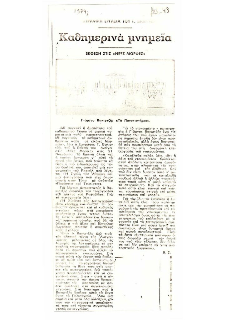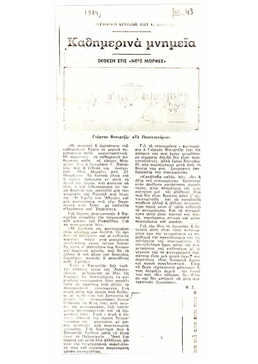 Φωτοαντίγραφο αποκόμματος εντύπου, χαρτί, 24,5×10 εκ., στα ελληνικά, κριτικής του/της Β.Σ. με θέμα την ατομική έκθεση έργων του Γιώργου Βακιρτζή, στην γκαλερί Νέες Μορφές στην Αθήνα. Το απόκομμα περιέχει εικονογράφηση.