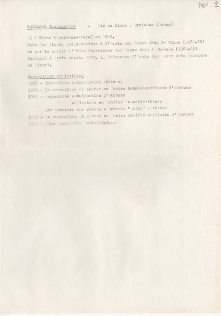 Φωτοαντίγραφο, δακτυλόγραφο, χαρτί, 29,5×21 εκ., στα ελληνικά, βιογραφικού σημειώματος του Μπάμπη Κρητικού. Περιέχει σπουδές και εκθέσεις.