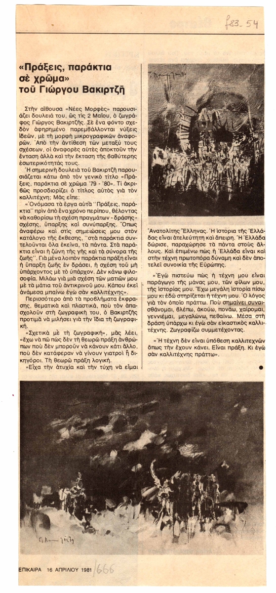 Απόκομμα, χαρτί, 29×12, 5 εκ., στα ελληνικά δημοσίευσης κριτικής αναφερόμενης σε ατομική έκθεση του Γιώργου Βακιρτζή η οποία διεξάγεται στην γκαλερί Νέες Μορφές στην Αθήνα.