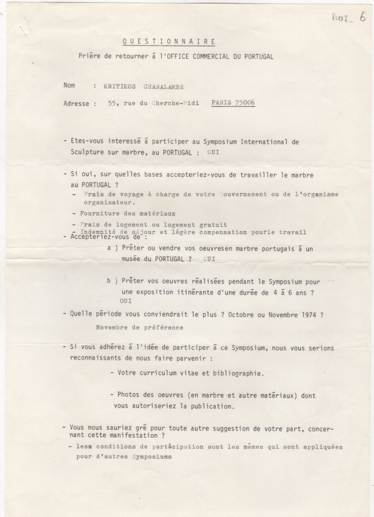 Ερωτηματολόγιο, δακτυλόγραφο, χαρτί, 30×21 εκ., στα γαλλικά, προς τον Μπάμπη Κρητικό, αναφορικά με τη συμμετοχή του σε συμπόσιο γλυπτικής.