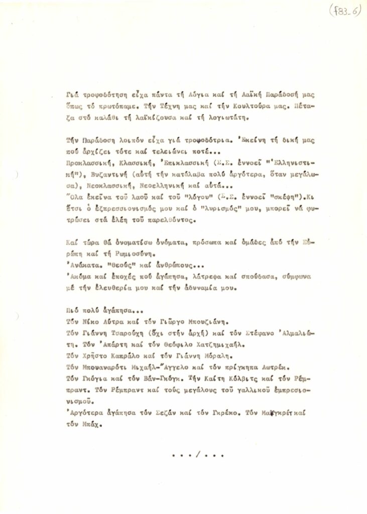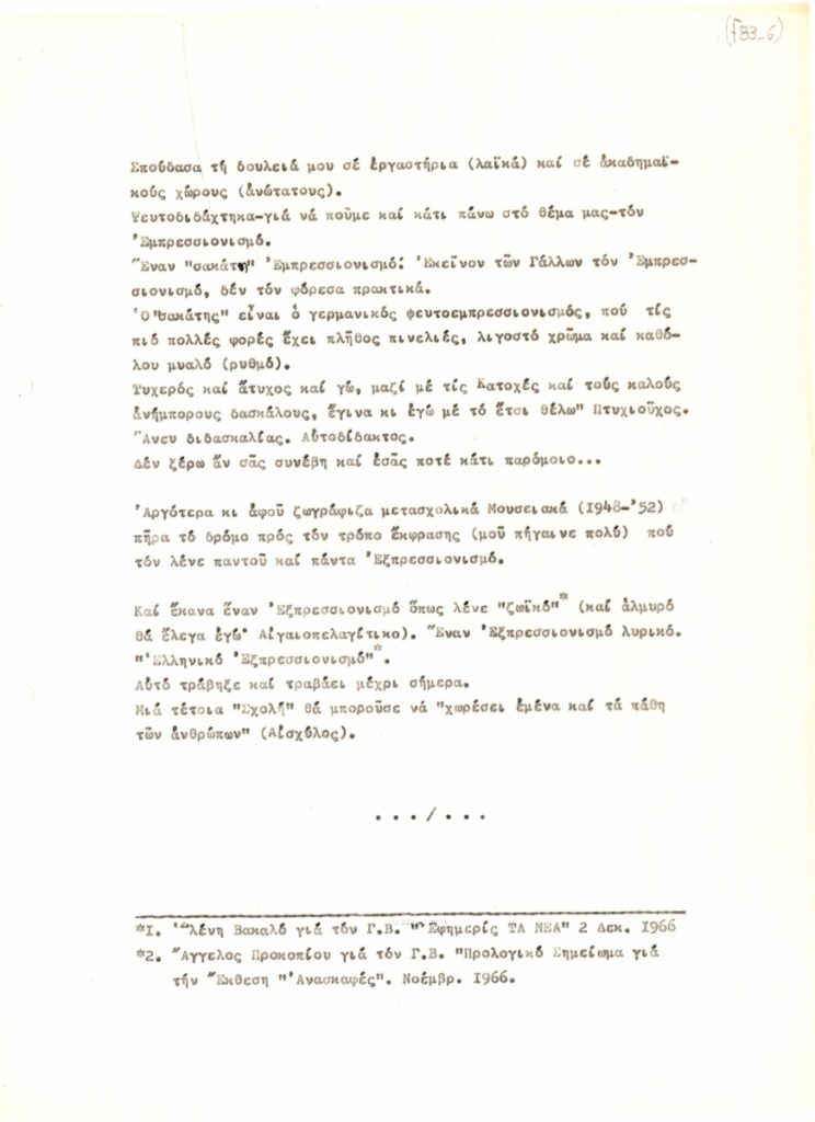 Κείμενο, δακτυλόγραφο, 9 φφ, 29×21 εκ., στα ελληνικά, του Γιώργου Βακιρτζή. Ο καλλιτέχνης αναφέρεται στις “Αισθητικές Πεποιθήσεις” του, σε καλλιτέχνες και ιδέες που αποτέλεσαν για τον ίδιο πηγή έμπνευσης. Στο κείμενο υπάρχει δεύτερος τίτλος “Οι Αισθητικές μου Πεποιθήσεις ή Καλλιτεχνική μου Δραστηριότητα Β’. Οκτώβριος-Νοέμβριος 1973-Από το ‘Who is who του Γ. Β’ στο Graphicart” και τίτλος “Αύγουστος 1974 Ανοικτές Σκέψεις. Πώς εργάζομαι ή πως θέλω να εργάζομαι”.