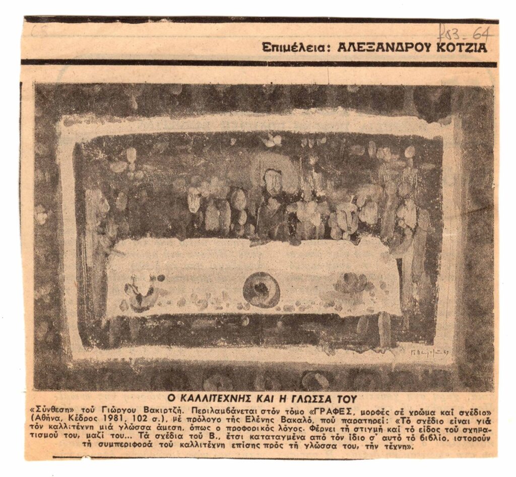 Απόκομμα, χαρτί, 14×15 εκ., στα ελληνικά, με αναπαραγωγή έργου του Γιώργου Βακιρτζή, που φέρει τον τίτλο ‘Σύνθεση’. Περιλαμβάνεται στον τόμο του με τίτλο “Γραφές, μορφές σε χρώμα και σχέδιο”.