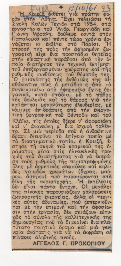 Απόκομμα, χαρτί, 12×5 εκ., στα ελληνικά, δημοσίευσης κριτικής έκθεσης της Τίτας Κριεζή, στην Αθήνα.