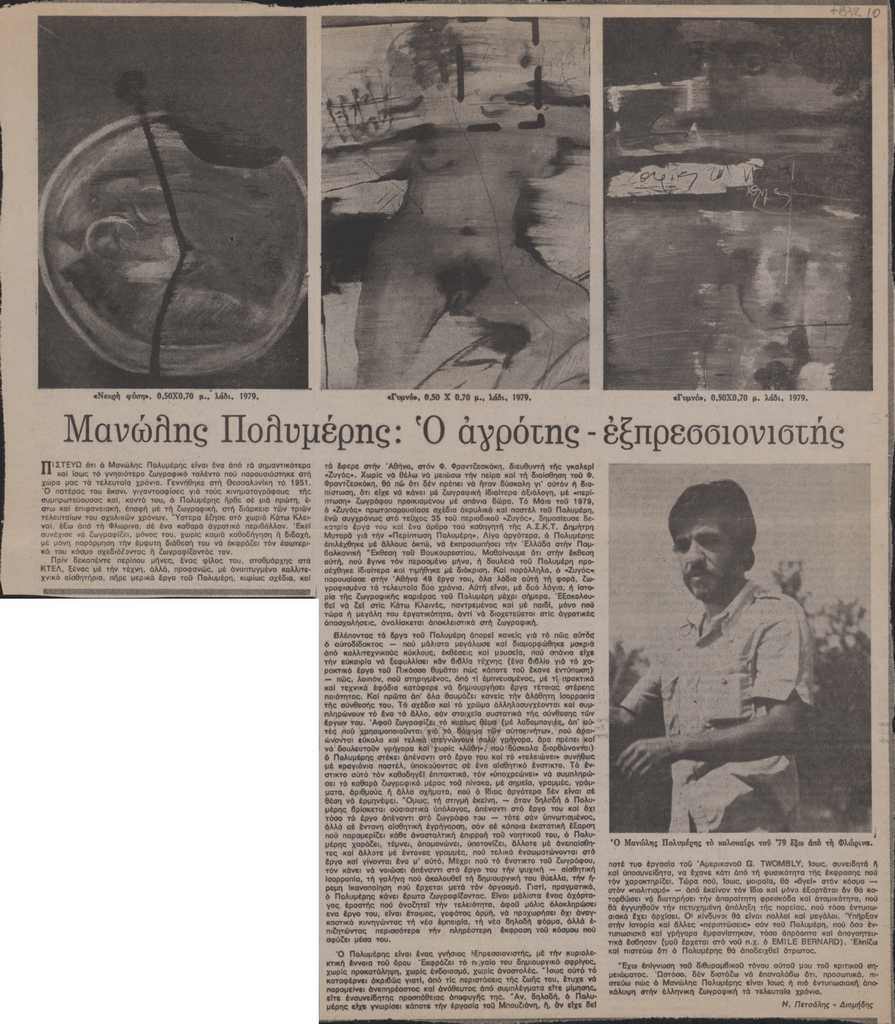 Απόκομμα, χαρτί ακανόνιστου μεγέθους, στα ελληνικά, δημοσίευσης άρθρου αναφερόμενου στο εικαστικό έργο του Μανώλη Πολυμέρη.