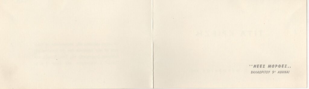 Πρόσκληση, χαρτόνι αναδιπλωμένο, 10×16,5 εκ., στα ελληνικά, εγκαινίων ατομικής έκθεσης της Τίτας Κριεζή.