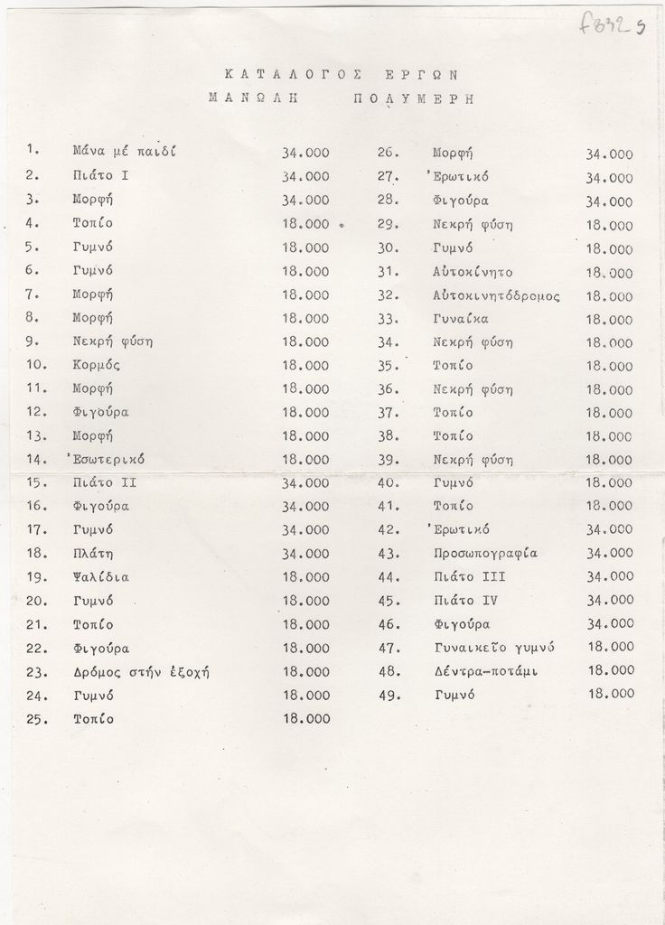 Φωτοαντίγραφο, χαρτί, 30×21 εκ., στα ελληνικά, τιμοκαταλόγου έργων έκθεσης του Μανώλη Πολυμέρη.
