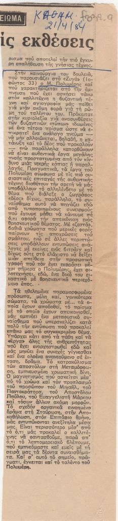 Απόκομμα, χαρτί, 28×6 εκ., στα ελληνικά, δημοσίευσης κριτικής έκθεσης του Μανώλη Πολυμέρη, η οποία διεξάγεται στην Galerie Ζυγός στην Αθήνα.