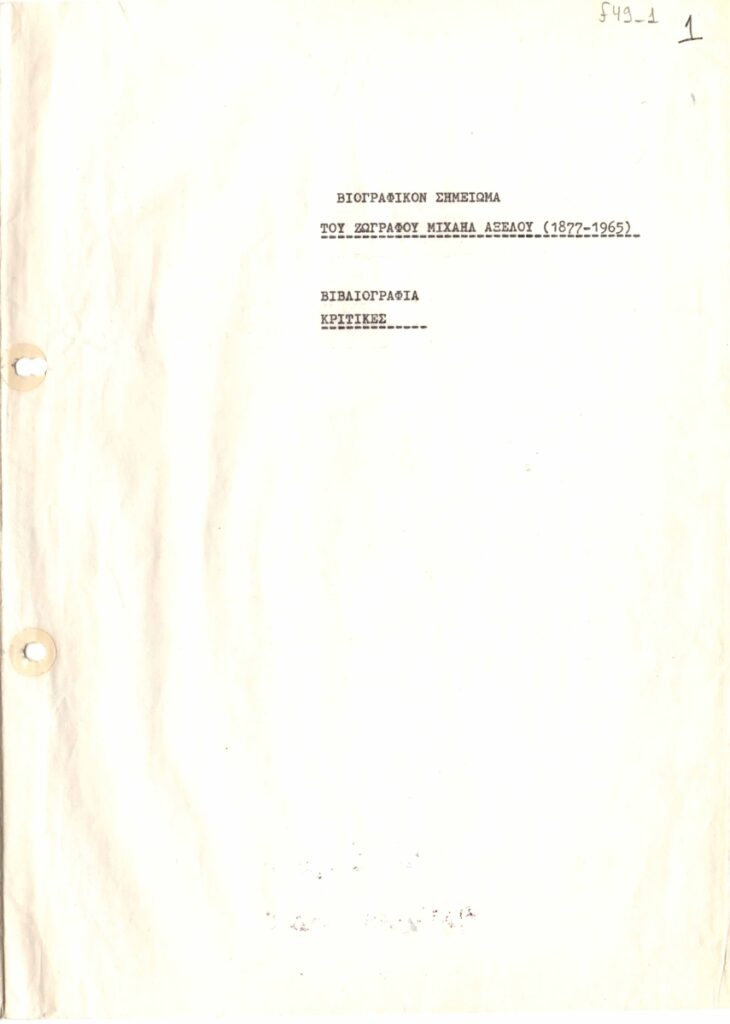 Βιογραφικό, δακτυλόγραφο, 6 φφ, 28,5×21εκ, στα ελληνικά, που φέρει τον τίτλο “Βιογραφικόν Σημείωμα του ζωγράφου Μιχαήλ Αξελού, 1877-1965, Βιβλιογραφία-Κριτικές”. Περιλαμβάνει προσωπικά στοιχεία, ειδικότητες του καλλιτέχνη, βιβλιογραφία και κριτικές γι’ αυτόν.