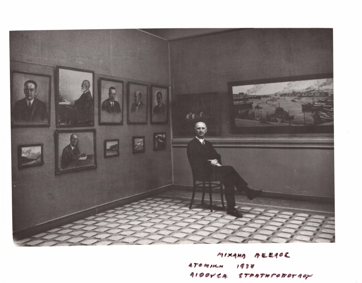 Φωτογραφία, α/μ, φωτογραφικό χαρτί, 18×24,3εκ, με τον Μιχαήλ Αξελό μπροστά από έργα του, στην ατομική του έκθεση το 1937, στην Αίθουσα Στρατηγοπούλου.