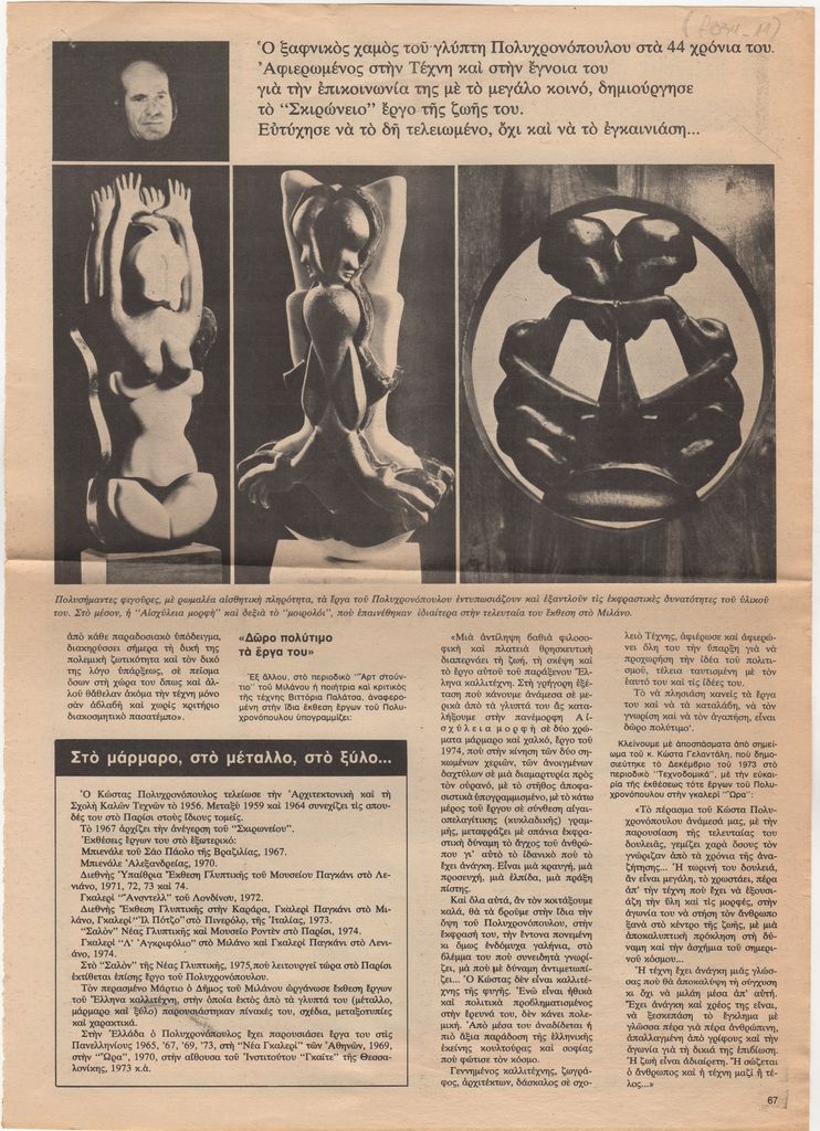 Απόκομμα, χαρτί, 2 φφ, 33×24 εκ., στα ελληνικά, δημοσίευσης άρθρου αφιερωμένου στον Κώστα Πολυχρονόπουλο, με αφορμή τον αιφνίδιο θάνατο του καλλιτέχνη.