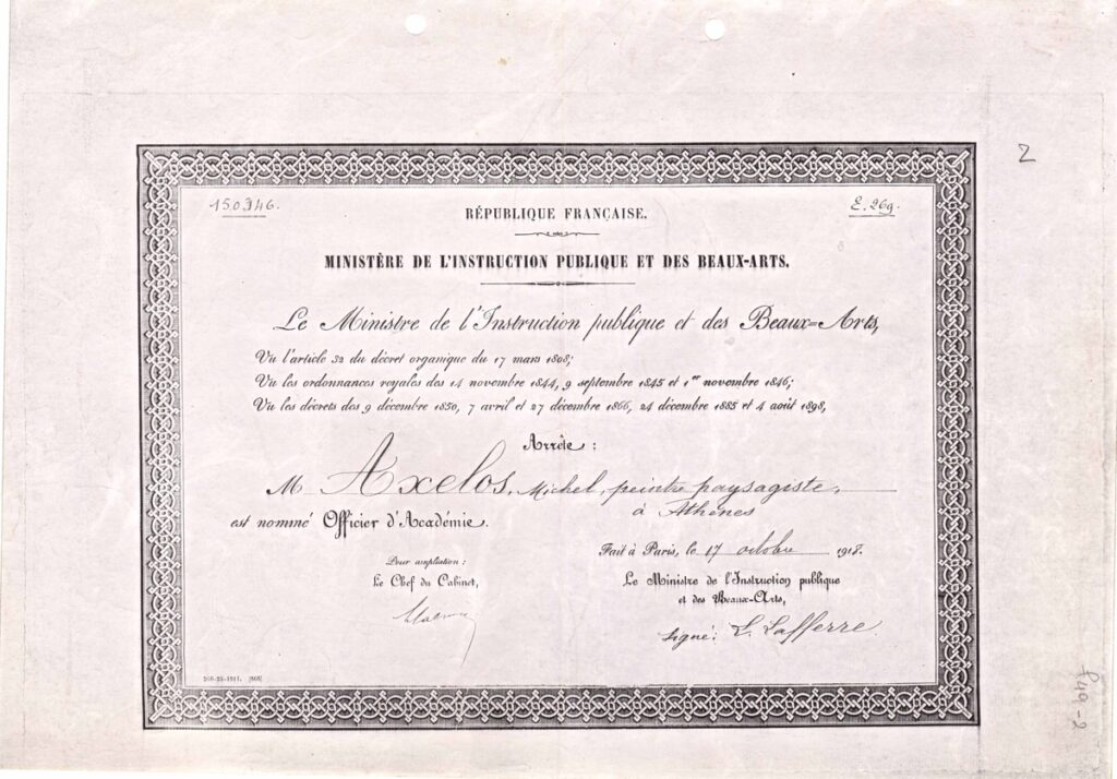 Φωτοαντίγραφο διπλώματος απονομής τίτλου, χαρτί, 21×29,5εκ, στα γαλλικά. Πρόκειται για φωτοαντίγραφο διπλώματος που απονεμήθηκε στον Μιχαήλ Αξελό, από το Ministère de l’ instruction et des Beaux-Arts, της Γαλλικής Δημοκρατίας, όπου απέκτησε τον τίτλο “Officier d’ Académie”, στο Παρίσι, 17/10/1918. Το έντυπο φέρει επιγραφές.