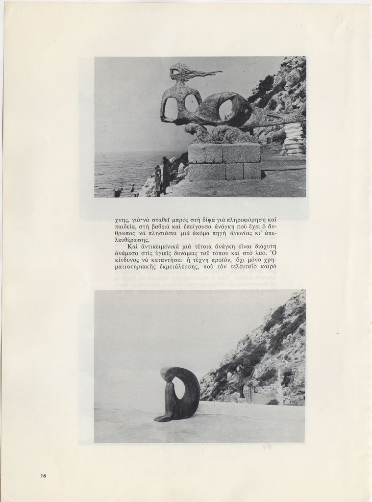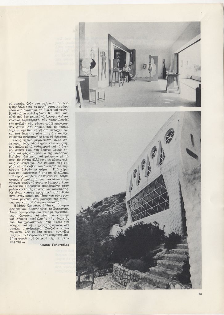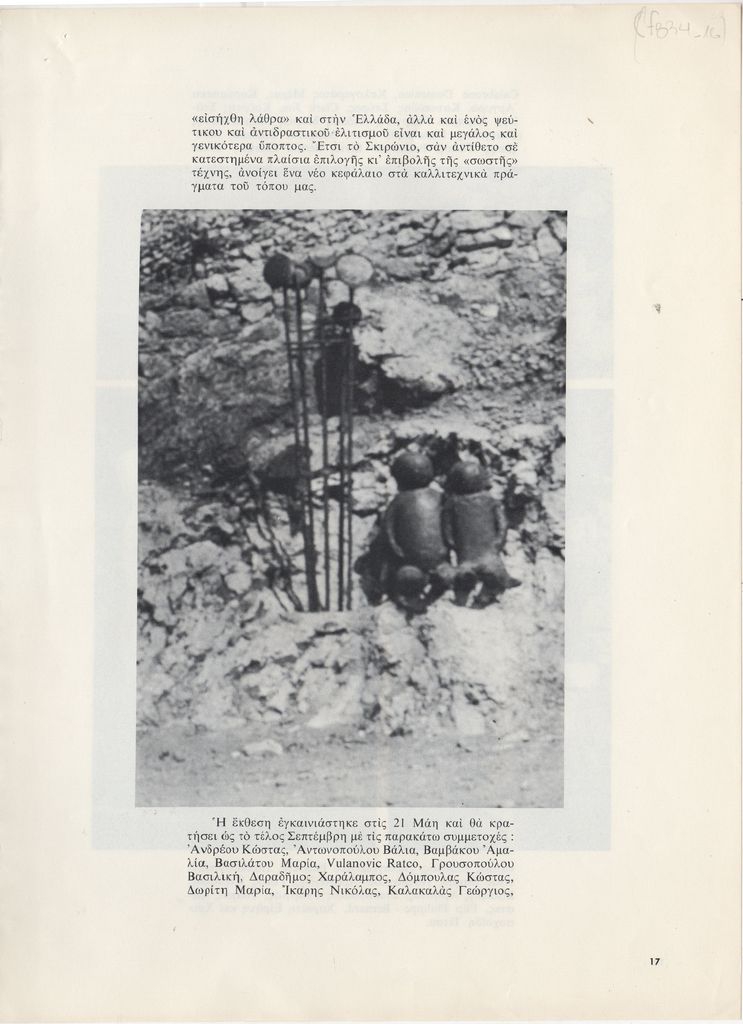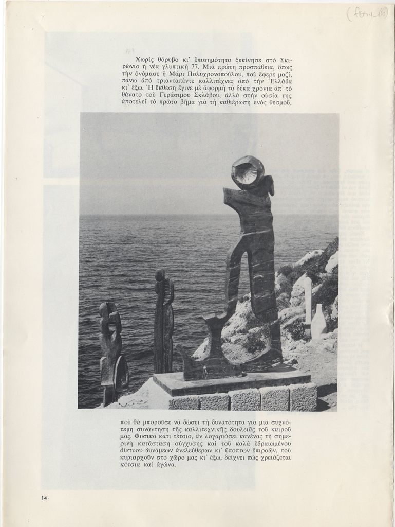 Απόκομμα, χαρτί ιλλουστρασιόν, 4 φφ, 28,5×21 εκ., στα ελληνικά, δημοσίευσης άρθρου αναφερόμενου στο Σκιρώνειο Μουσείο. Γίνεται λόγος για την κατάστασή του, τις δραστηριότητές του μετά το θάνατο του ιδρυτή του. Ακόμη γίνεται λόγος για την ομαδική έκθεση γλυπτικής καλλιτεχνών, αφιερωμένης στον Γεράσιμο Σκλάβο.