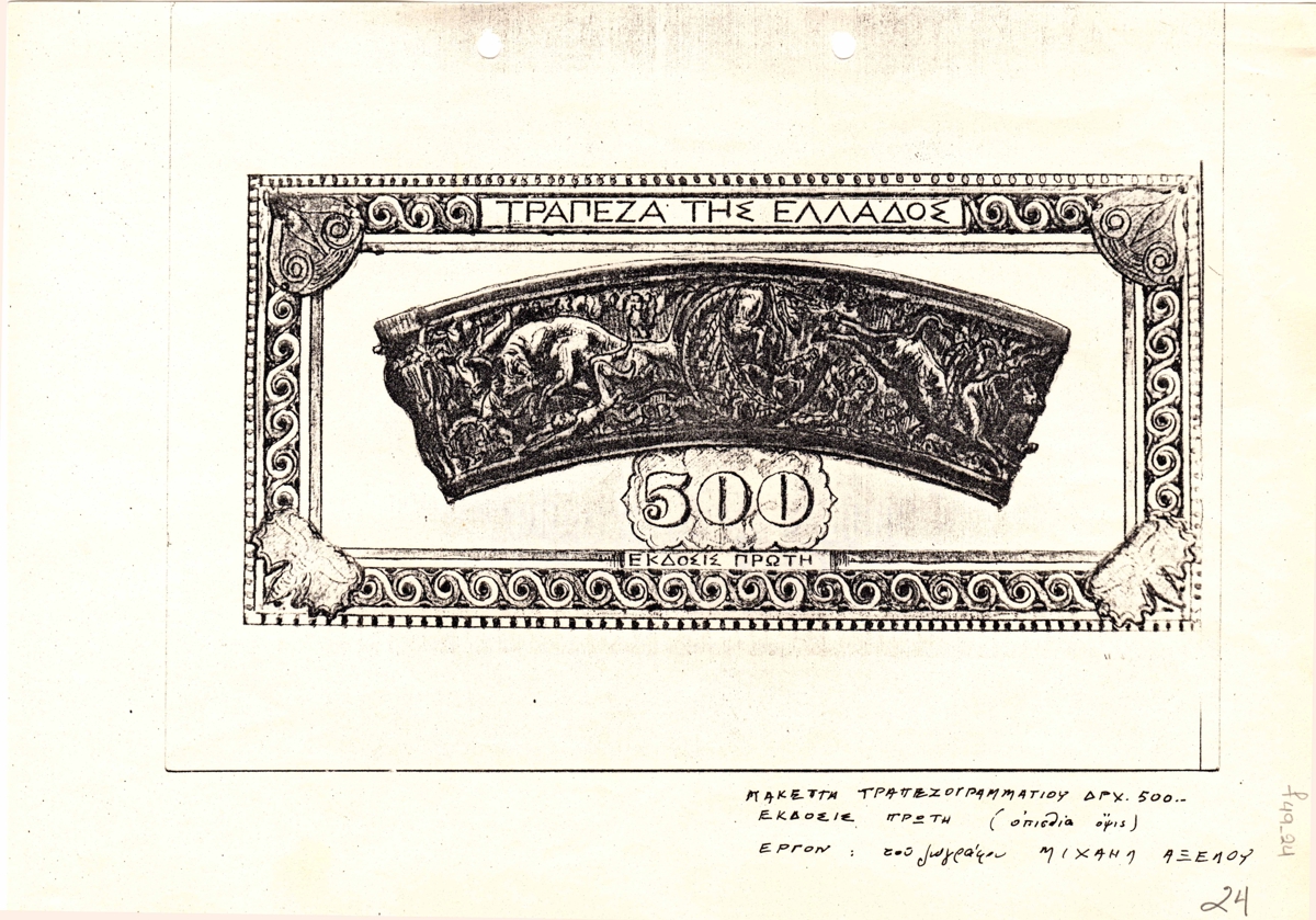 Φωτοαντίγραφο, χαρτί, 21×29,5εκ, με αναπαραγωγή μακέτας τραπεζογραμματίου των 500 δραχμών. Πρόκειται για την πρώτη έκδοση της οπίσθιας όψης, έργου του ζωγράφου Μιχαήλ Αξελού. Κάτω από την εικονογραφήση υπάρχουν επιγραφές.