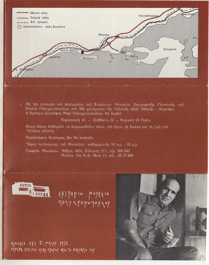 Ενημερωτικό έντυπο και πρόσκληση, χαρτόνι αναδιπλωμένο, 27×21 εκ., στα ελληνικά, του Σκιρώνειου Μουσείου Πολυχρονόπουλου.