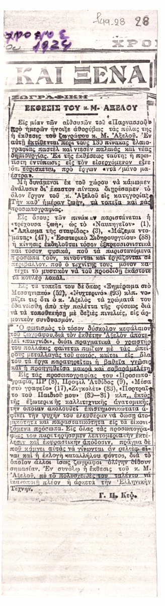 Φωτοαντίγραφο άρθρου, χαρτί, 26,5×7εκ, στα ελληνικά, αναφερόμενου στο έργο του Μιχαήλ Αξελού, με αφορμή έκθεσή του.