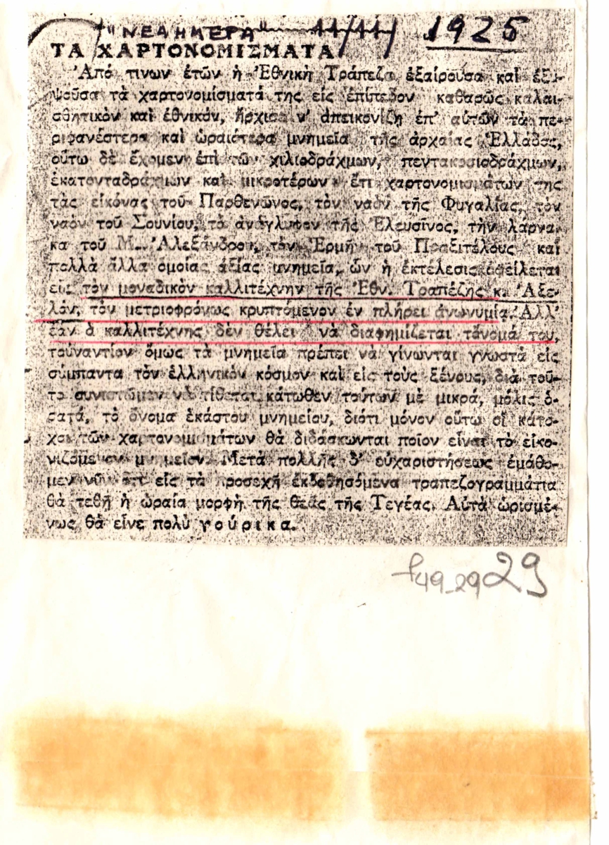 Φωτοαντίγραφο δημοσίευσης άρθρου, χαρτί, 9×9 εκ, στα ελληνικά, αναφερόμενου στα χαρτονομίσματα που φιλοτέχνησε ο καλλιτέχνης Μιχαήλ Αξελός.
