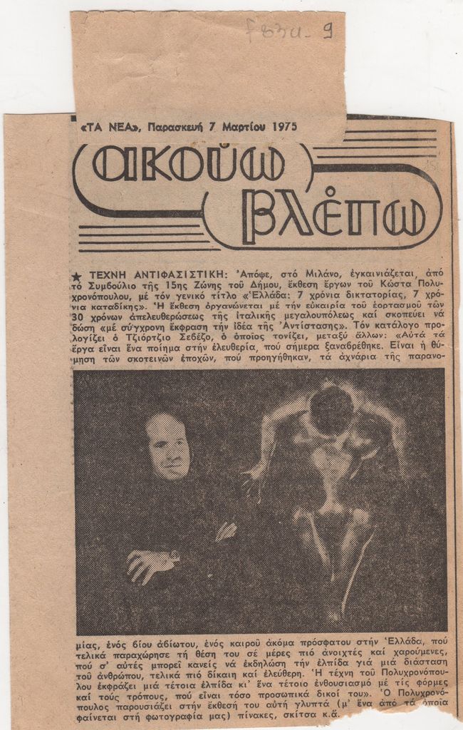 Απόκομμα, χαρτί ακανόνιστου μεγέθους, στα ελληνικά, δημοσίευσης άρθρου αναφερόμενου σε εγκαίνια έκθεσης του Κώστα Πολυχρονόπουλου, η οποία διεξάγεται στο Μιλάνο.