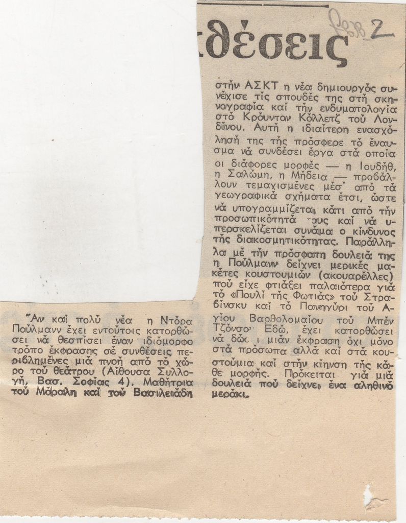 Απόκομμα, χαρτί ακανόνιστου μεγέθους, στα ελληνικά, δημοσίευσης κριτικής έκθεσης της Ντόρας Πούλμαν, η οποία διεξάγεται στην αίθουσα Συλλογή στην Αθήνα. Τονίζεται ο ιδιαίτερος χαρακτήρας των έργων της καλλιτέχνιδας με επιρροές από το θέατρο.