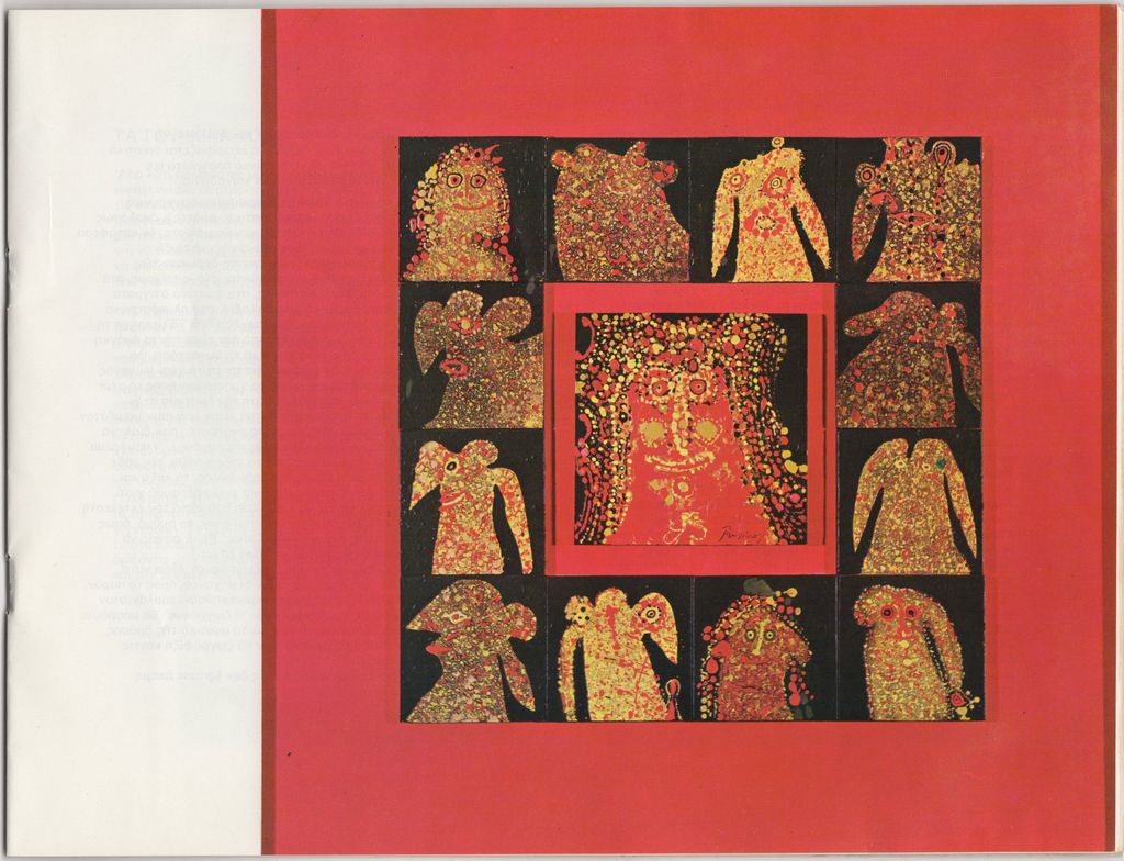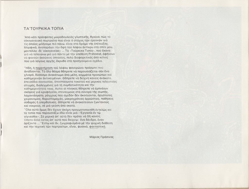 Κατάλογος, χαρτί ιλλουστρασιόν, 8 φφ, 21×27,5 εκ., στα ελληνικά, έκθεσης ζωγραφικής και σχεδίων του Μάριου Πράσινου στην Αίθουσα Τέχνης Αθηνών, σε σύμπραξη με την Galerie de France.