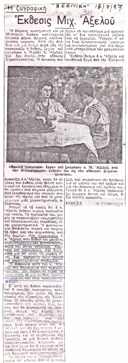 Φωτοαντίγραφο, χαρτί, 31,5×11,5εκ, στα ελληνικά, άρθρου αναφερόμενου σε έκθεση του Μιχαήλ Αξελού.