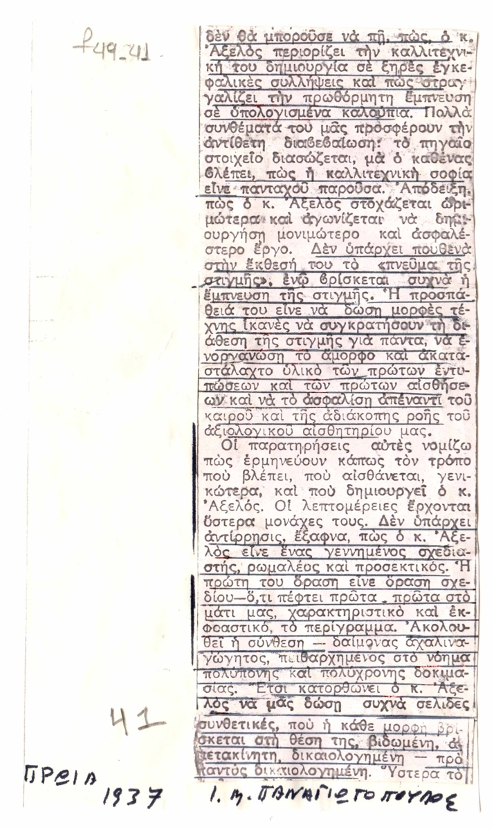Φωτοαντίγραφο, χαρτί, 15×5,5εκ, στα ελληνικά, δημοσίευσης άρθρου αναφερόμενου στον Μιχαήλ Αξελό και το έργο του.