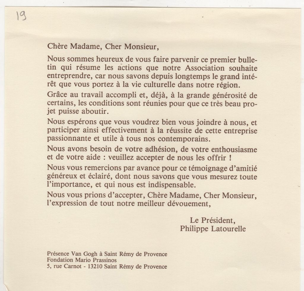 Έντυπο, χαρτί, 16×16.5 εκ., στα γαλλικά, με κείμενο του Philippe Latourelle, προέδρου της Fondation Mario Prassinos στο Saint Rémy de Provence στη Γαλλία, απευθυνόμενο προς κάθε ενδιαφερόμενο που έλαβε το ενημερωτικό έντυπο του Ιδρύματος.