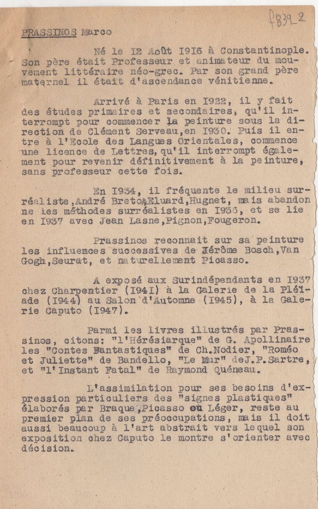 Βιογραφικό, δακτυλόγραφο, 21.5×14 εκ., στα γαλλικά, του Μάριου Πράσινου.