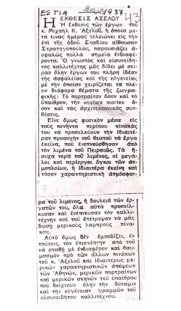 Φωτοαντίγραφο, χαρτί, 16,5×6εκ, στα ελληνικά, δημοσίευσης κριτικής έκθεσης του Μιχαήλ Αξελού η οποία διεξάγεται στην αίθουσα Στρατηγοπούλου.