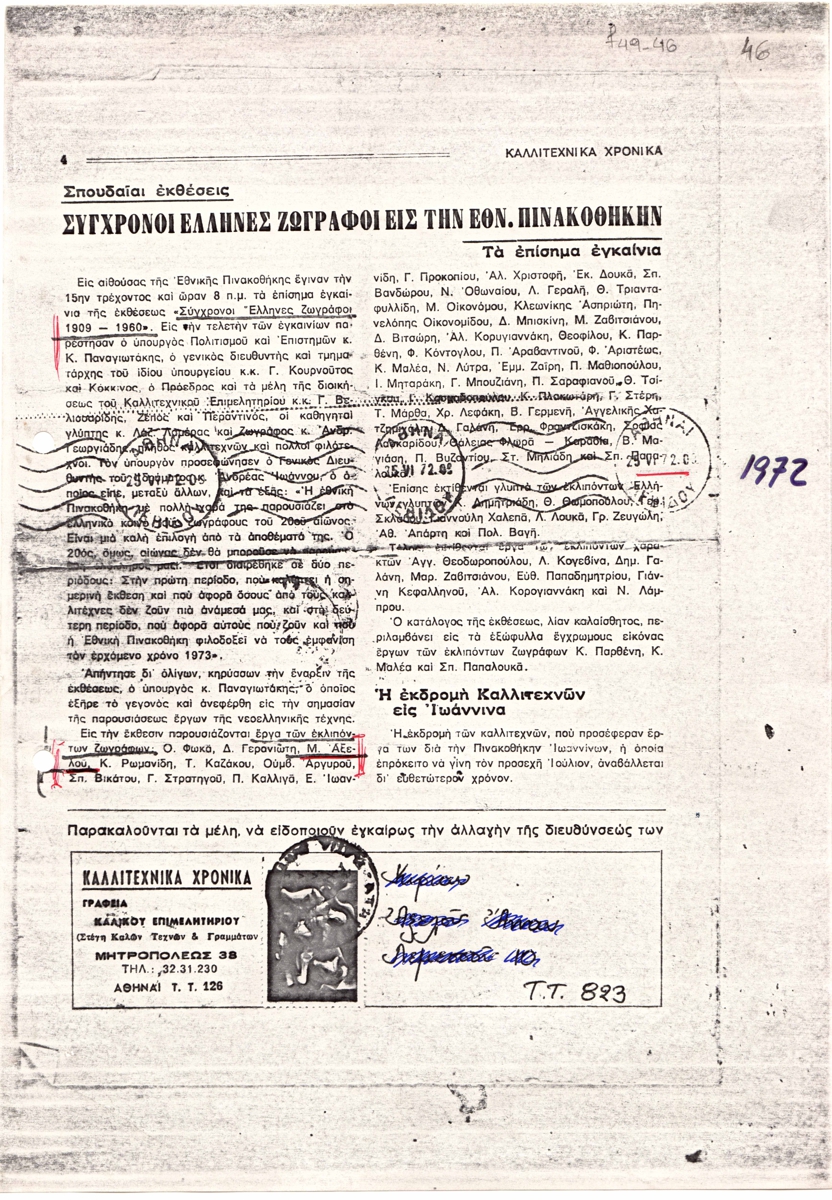 Φωτοαντίγραφο, χαρτί, 29,5×21εκ, στα ελληνικά, άρθρου που εντάσσεται στη στήλη ‘Σπουδαίαι εκθέσεις’ και αναφέρεται στα επίσημα εγκαίνια έκθεσης με τίτλο “Σύγχρονοι Έλληνες Ζωγράφοι 1909-1960”, στην Εθνική Πινακοθήκη Αθηνών, κατά το 1972. Ανάμεσα στους καλλιτέχνες ο Μιχαήλ Αξελός. Το απόκομμα ταχυδρομήθηκε στην Άννα Αξελού και φέρει επιγραφές.