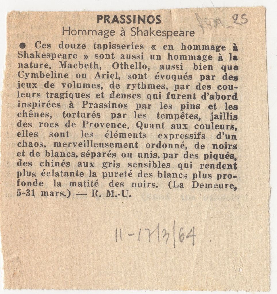 Απόκομμα, χαρτί, 8,5×8 εκ., στα γαλλικά, δημοσίευσης άρθρου αναφερόμενου σε έκθεση του Μάριου Πράσινου στο Παρίσι. Η έκθεση έχει ως θέμα της τους Σεξπηρικούς ήρωες.