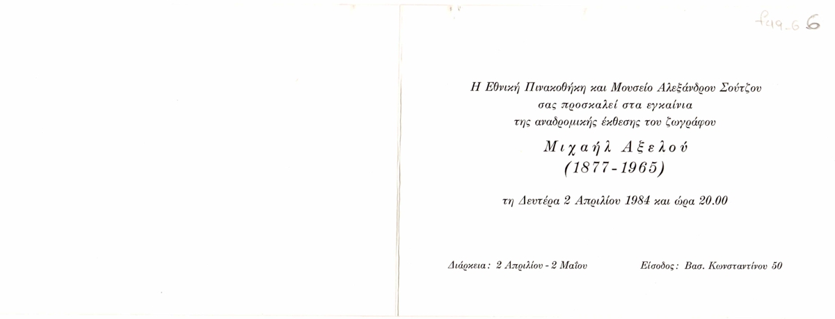 Πρόσκληση, χαρτόνι αναδιπλωμένο, 11×15,5εκ, στα ελληνικά, εγκαινίων αναδρομικής έκθεσης του Μιχαήλ Αξελού.